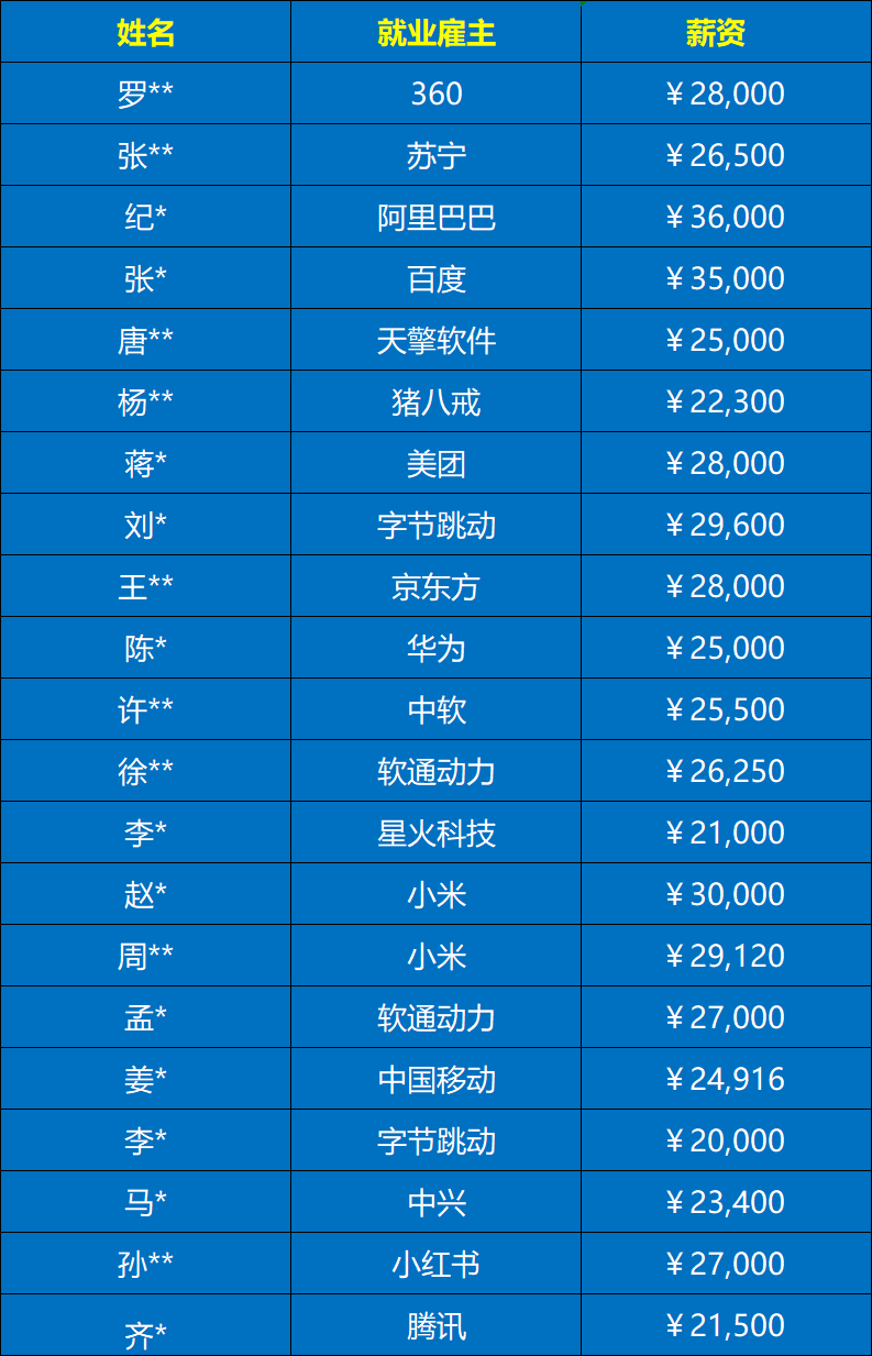 参加培优菁英班的学员将优先取得合作企业实习机会,集团将给予就业直通车的服务,以订单培养的形式输送到华为、国家电网、润和、K8凯发一触即发、浩鲸、中国擎天软件等知名IT企业。根据学生个人意愿结合企业用人需求,落实在南京、苏州、济南、北京、上海、杭州、深圳等城市就业。